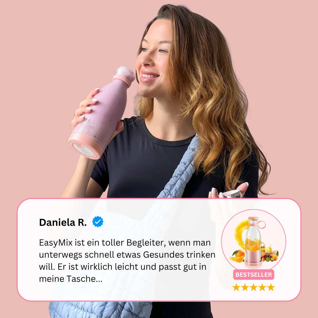 Lisa war immer auf der Suche nach einem praktischen Mixer, den sie ins Büro und zum Sport mitnehmen kann. Mit EasyMix hat sie endlich einen Begleiter, der klein, leicht und leistungsstark genug für ihre grünen Smoothies ist.