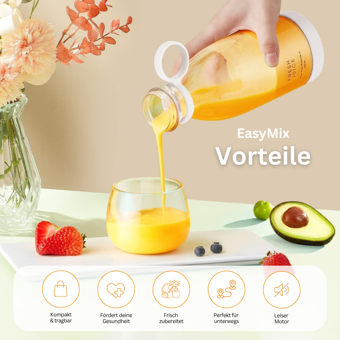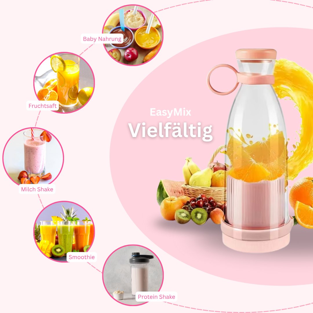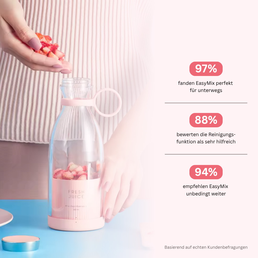 EasyMix ist ein tragbarer Mixer und Trinkflasche in einem. Mit seinem leistungsstarken Motor püriert er gefrorene Früchte, Eis, Nüsse und Gemüse blitzschnell.
